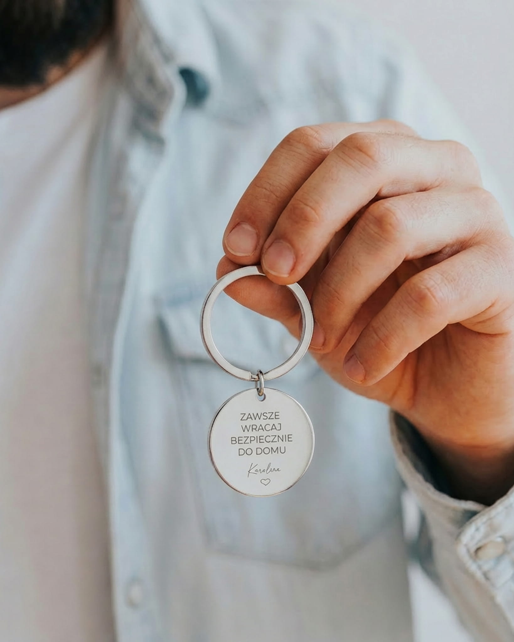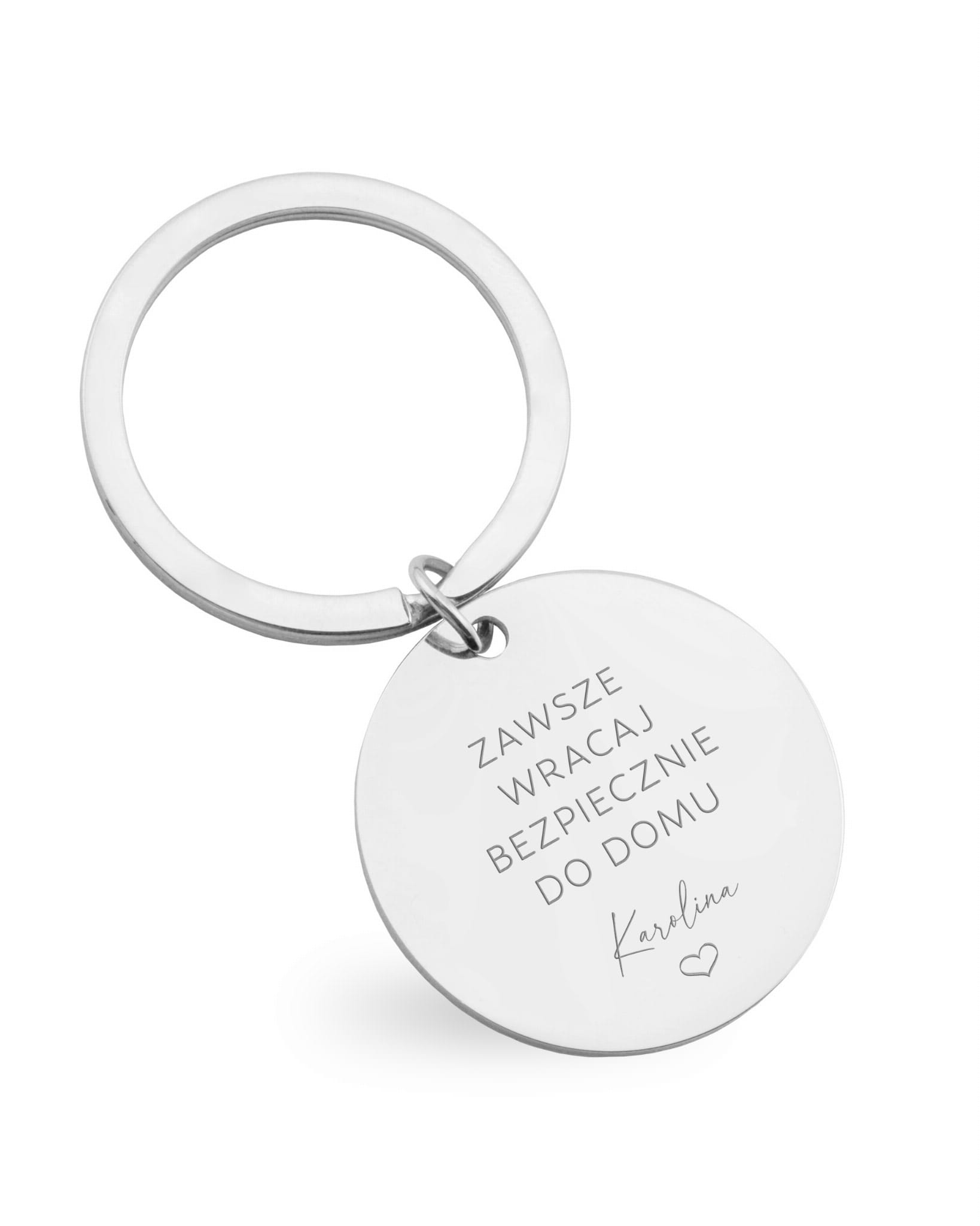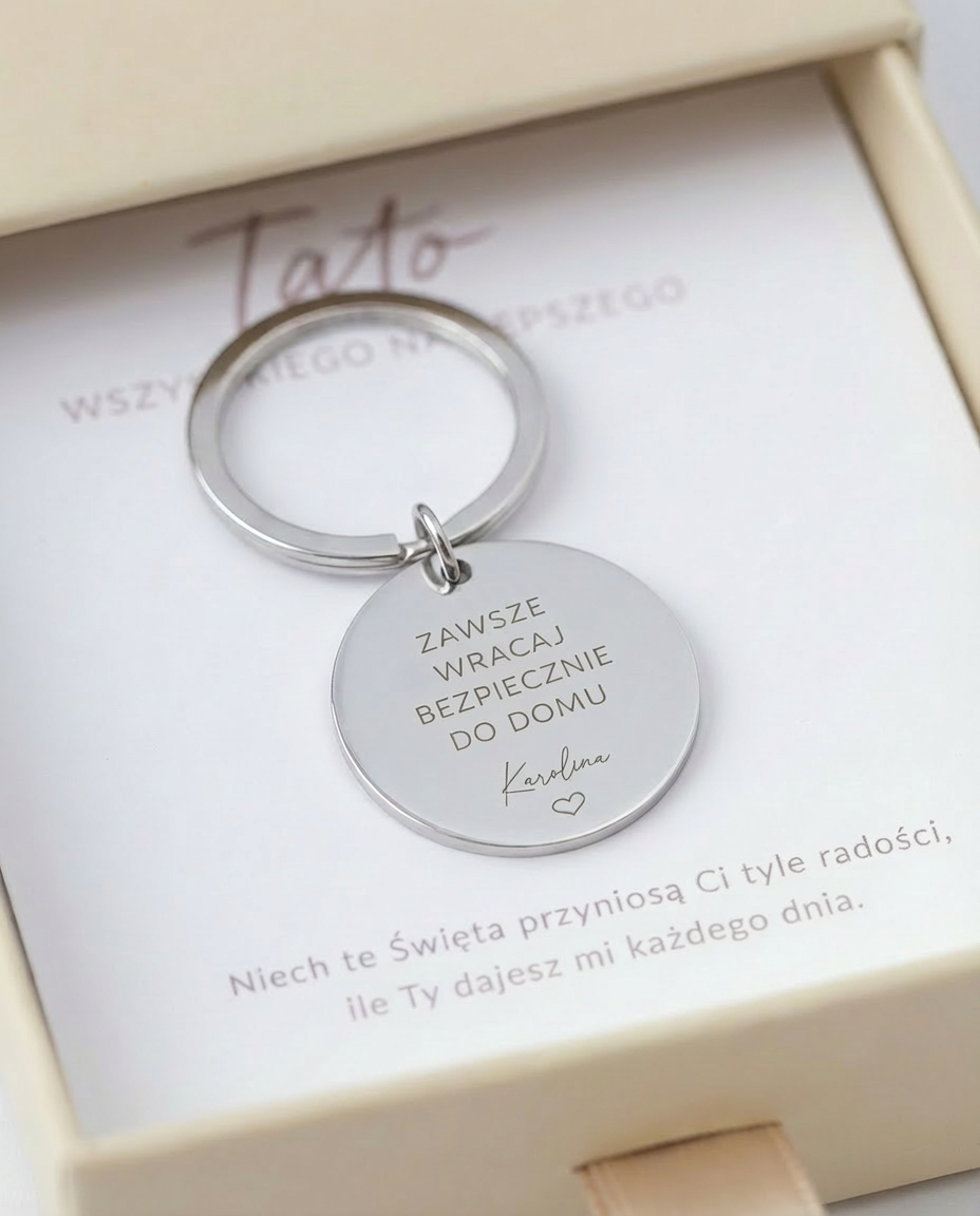 Brelok z grawerem "zawsze wracaj bezpiecznie do domu" oraz personalizacją imienną– w ekskluzywnym pudełku z dedykacją