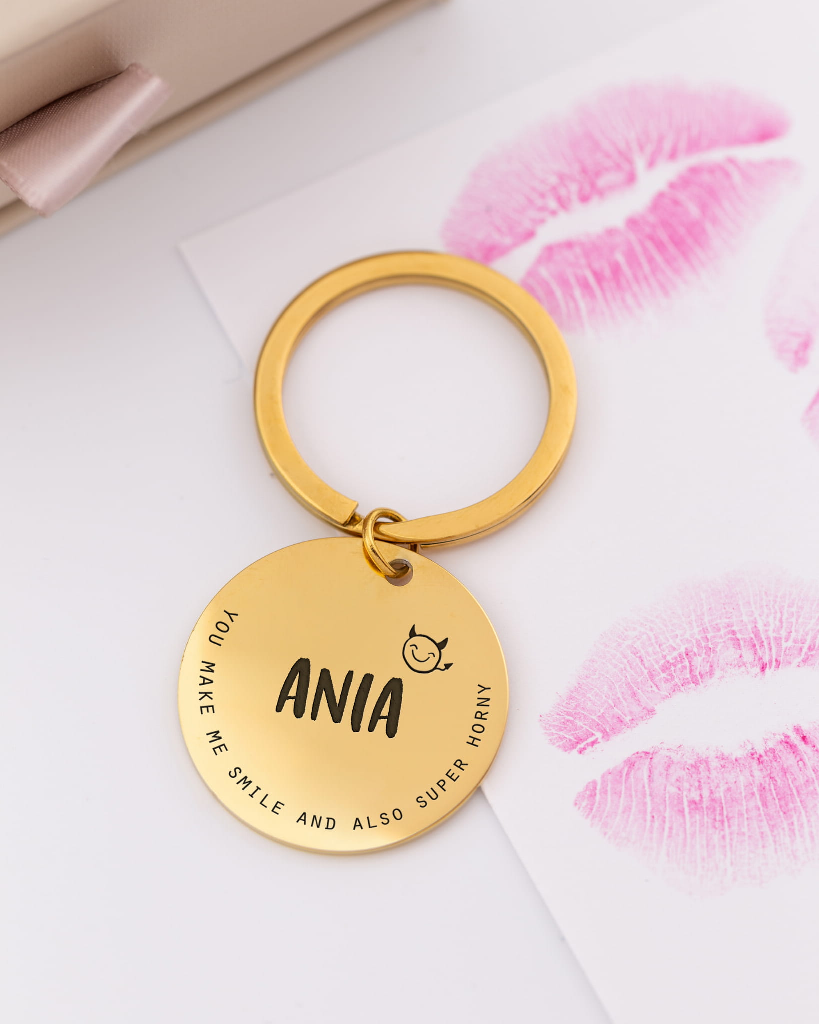 Brelok złoty z pikantnym grawerem w pudełku z dedykacją | chroniony design Sunsis