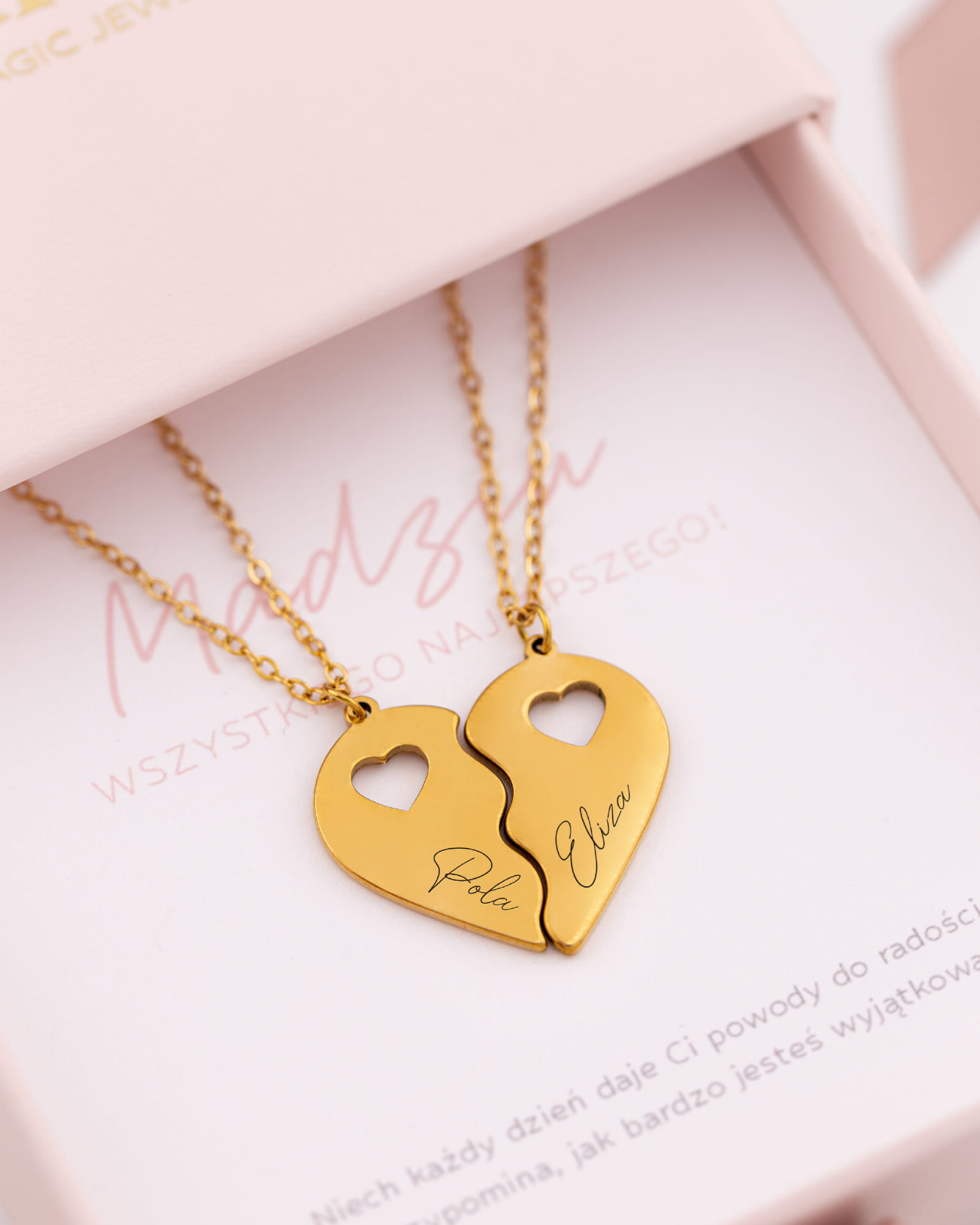 Dwa naszyjniki pozłacane BFF połówki serduszka z grawerem w pudełku z dedykacją