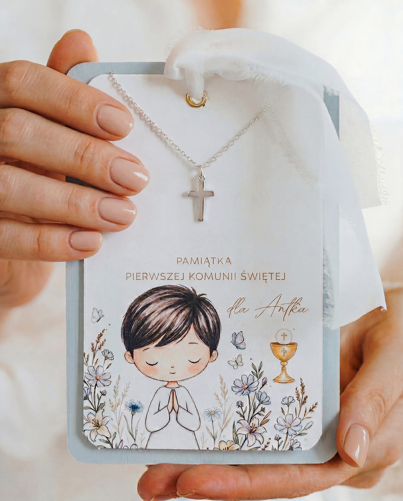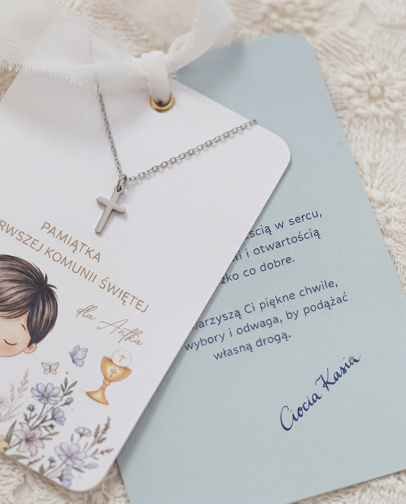 Krzyżyk na łańcuszku z kartą z życzeniami - Pamiątka Pierwszej Komunii Świętej dla chłopca
