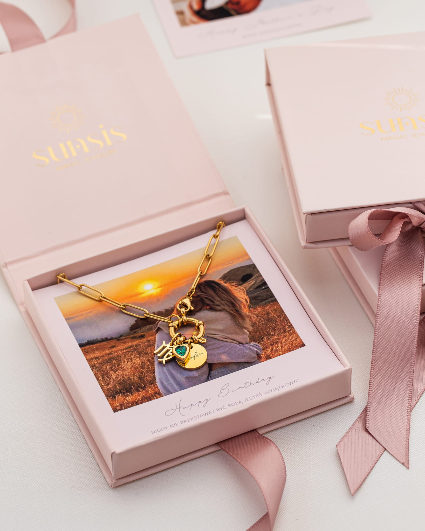 Ten wyjątkowy naszyjnik zapakowany jest w pełni personalizowane ekskluzywne pudełko prezentowe z satynową wstążką, które staje się czymś więcej niż tylko opakowaniem... To piękne tło dla Twoich emocji, wspomnień i miłości.