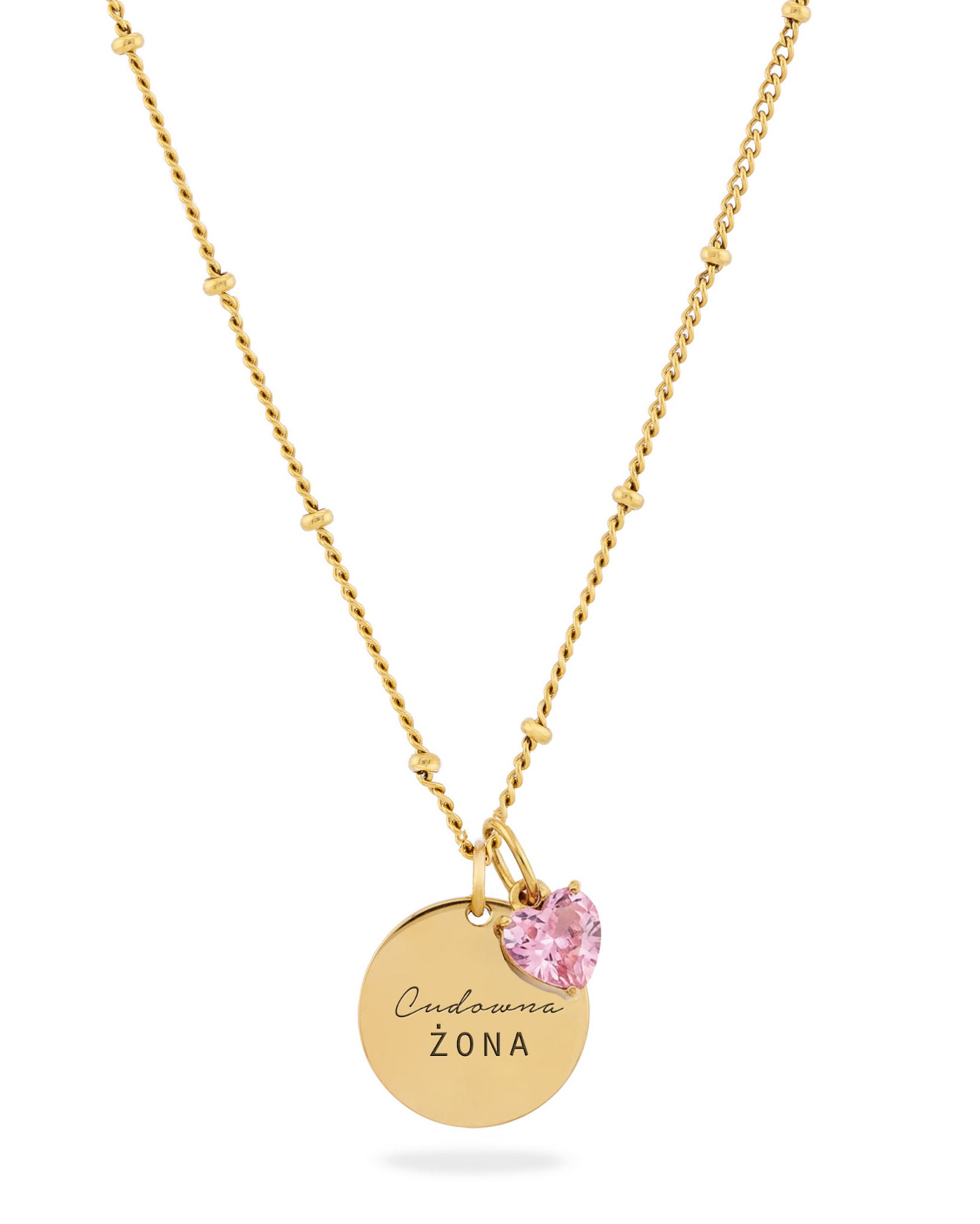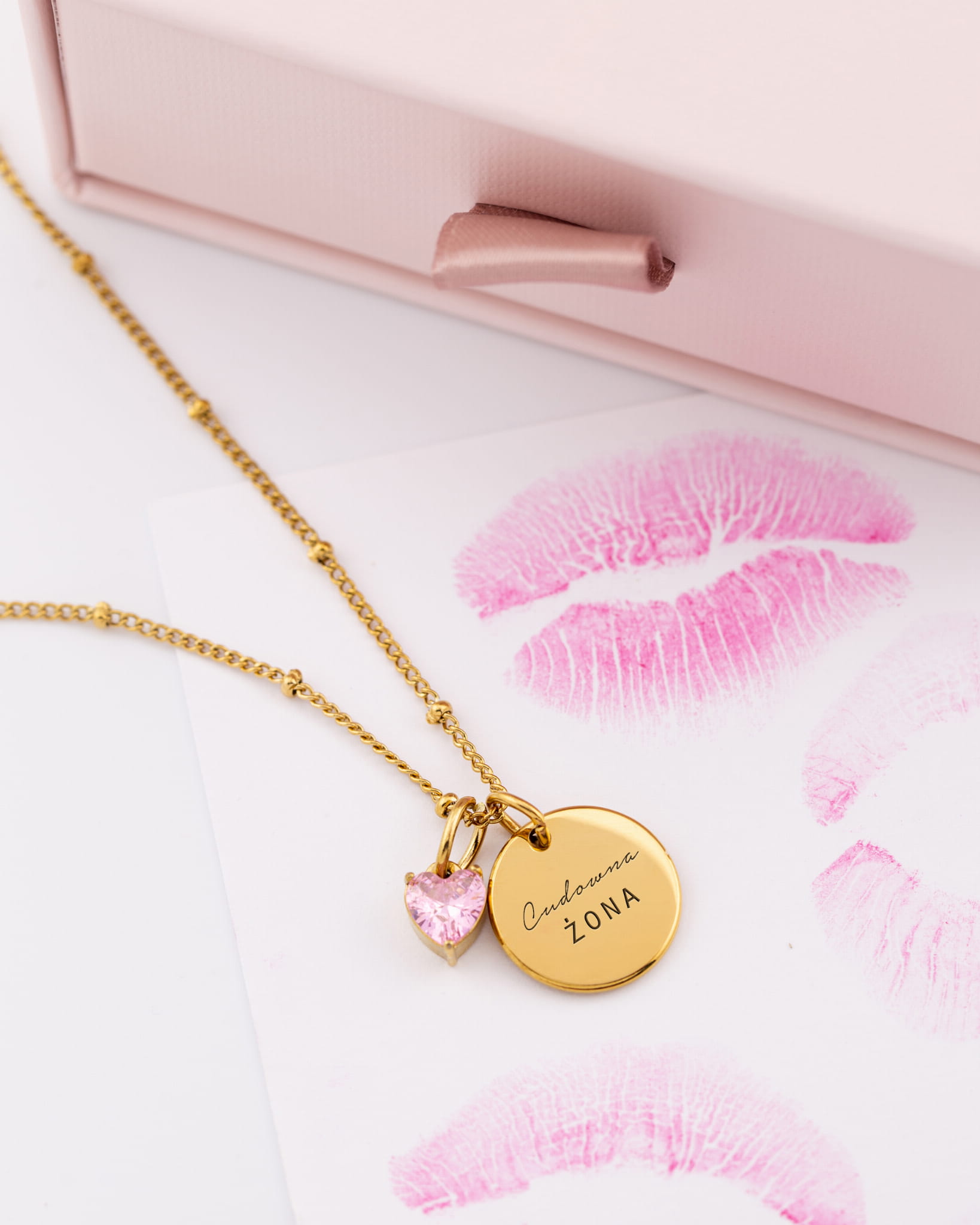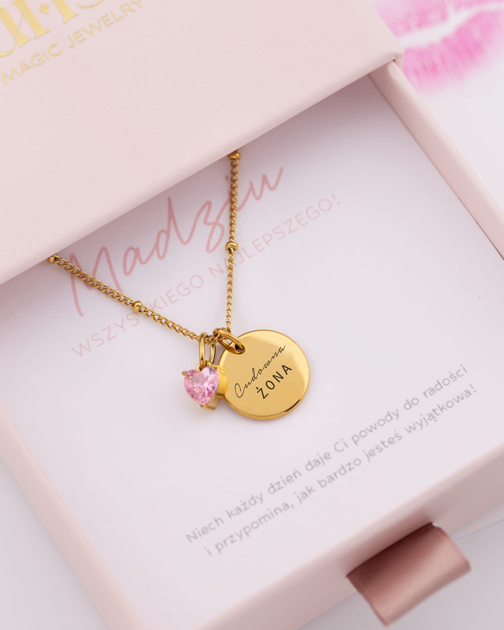 Naszyjnik pozłacany z grawerem dla żony i serduszkiem w pudełku z dedykacją