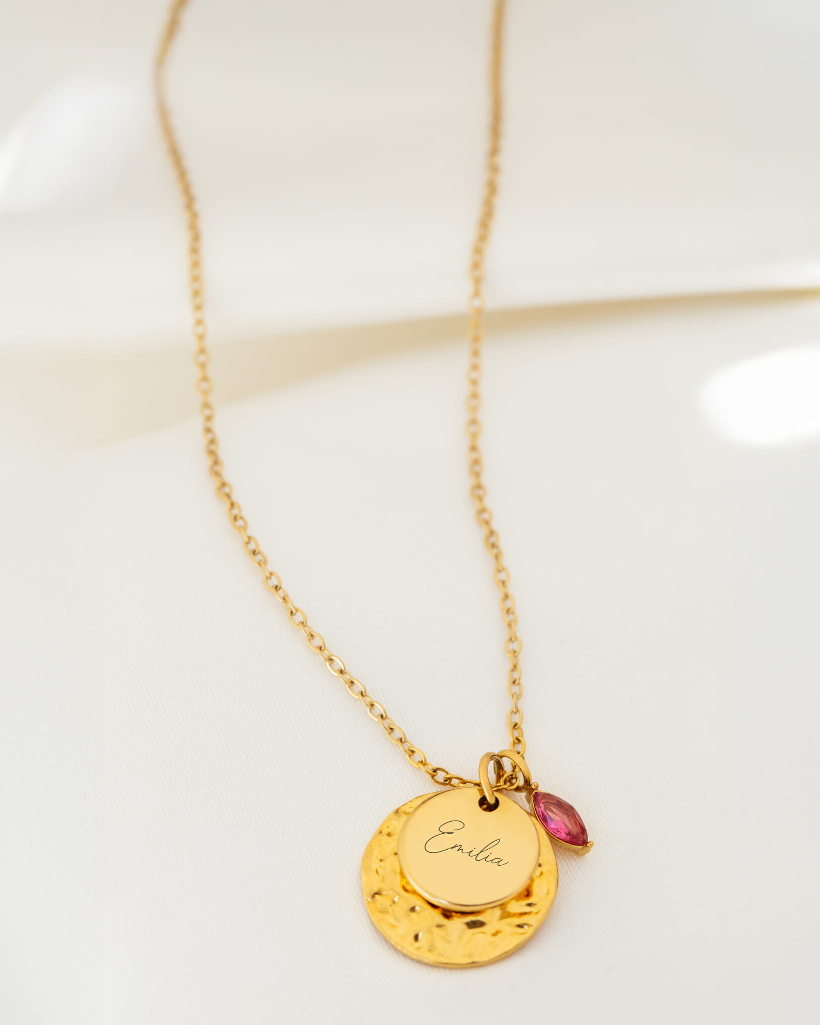 Naszyjnik z imieniem, cyrkonią urodzeniową oraz pastylką młotkowaną + pudełko ze zdjęciem