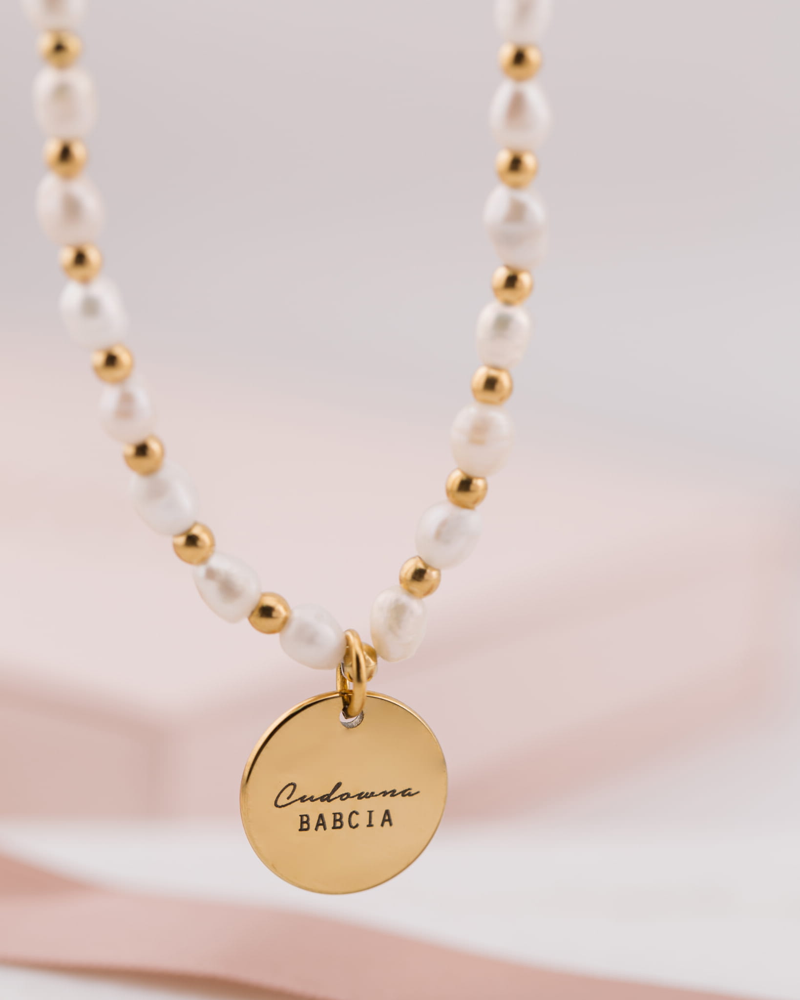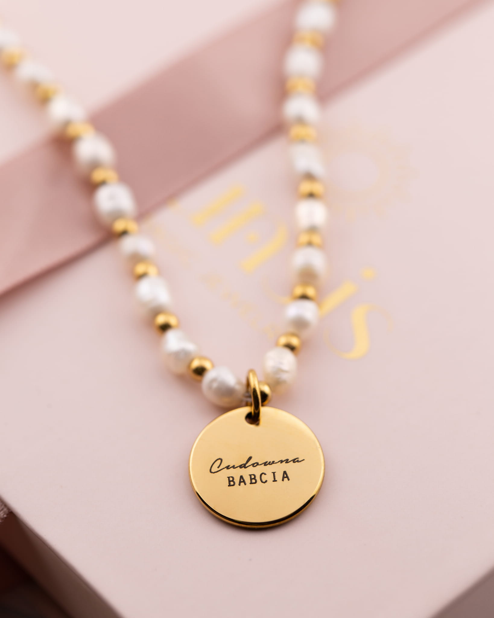 Naszyjnik z pereł hodowlanych dla babci z grawerem w pudełku z dedykacją | pozłacany