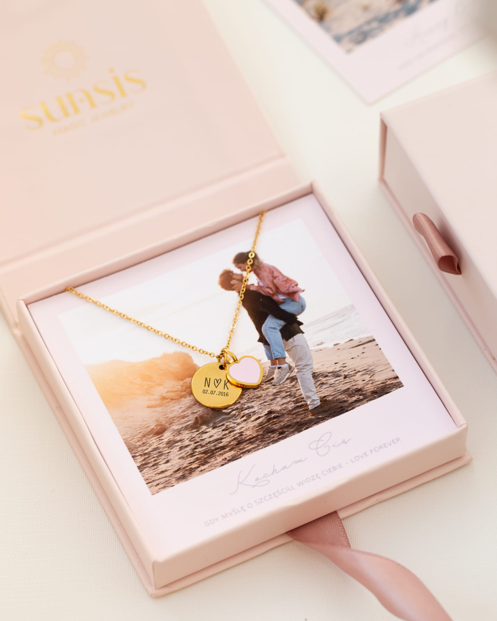 Ten wyjątkowy naszyjnik zapakowany jest w pełni personalizowane ekskluzywne pudełko prezentowe z satynową wstążką, które staje się czymś więcej niż tylko opakowaniem... To piękne tło dla Twoich emocji, wspomnień i miłości.